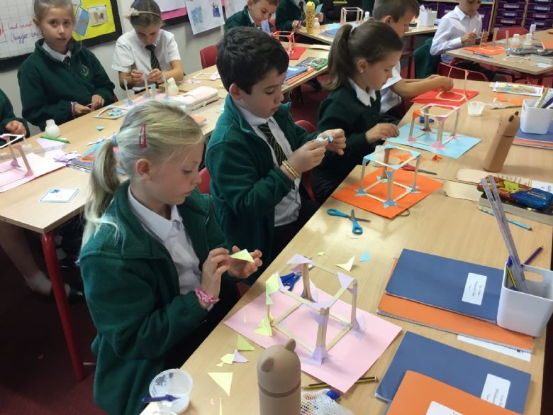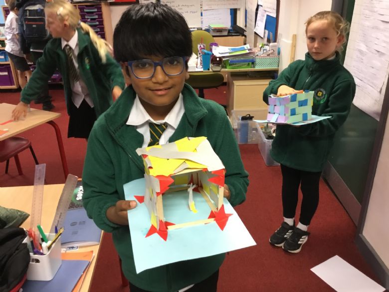 In Autumn 1, we learnt how to make strong and sturdy structures. We practised a range of designs using cocktail sticks and sweets then we moved on to designing our own pavilions. To build these, we used lollysticks and cardboard triangles. Once we had made the structure, we used weaving skills to make the walls and roof.